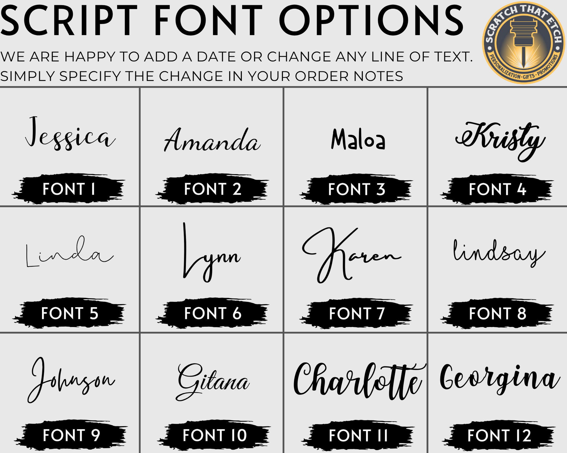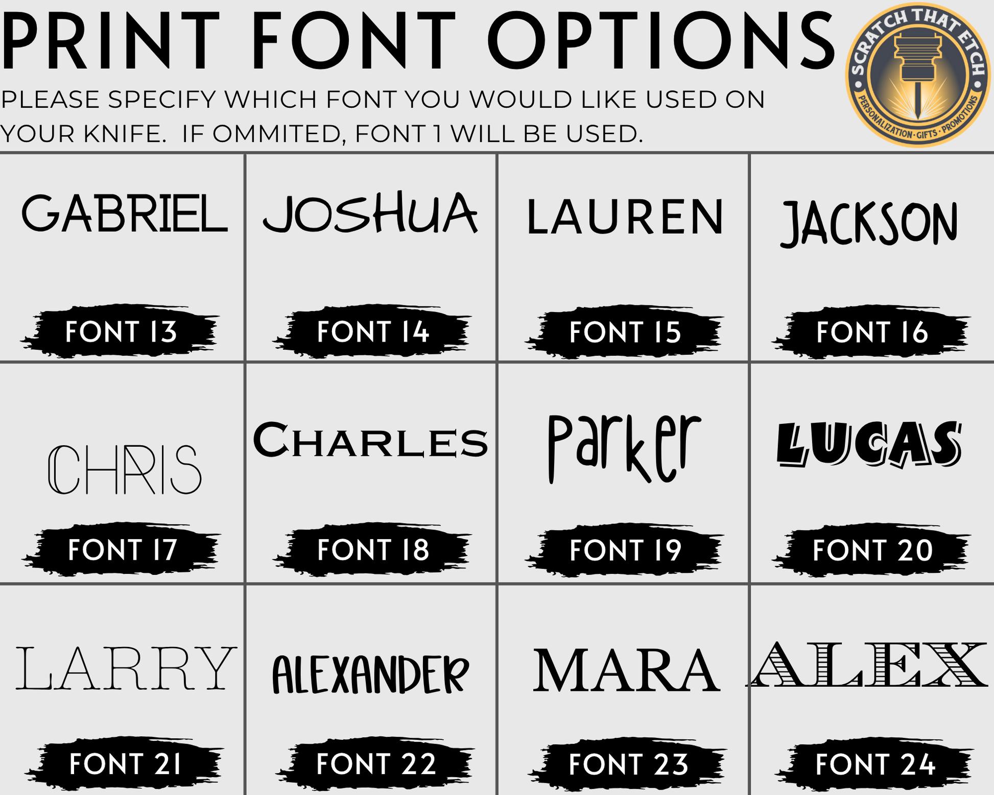Elevate a classic with a personalized Buck 110 Folding Hunter Knife. The razor-sharp 420HC steel clip point pairs with an elegant ebony handle and solid brass bolsters. Choose from multiple font options to add a name or initials for a one-of-a-kind keepsake. Durable enough for everyday carry and handsome enough for display, it’s a standout choice for outdoorsmen and collectors.