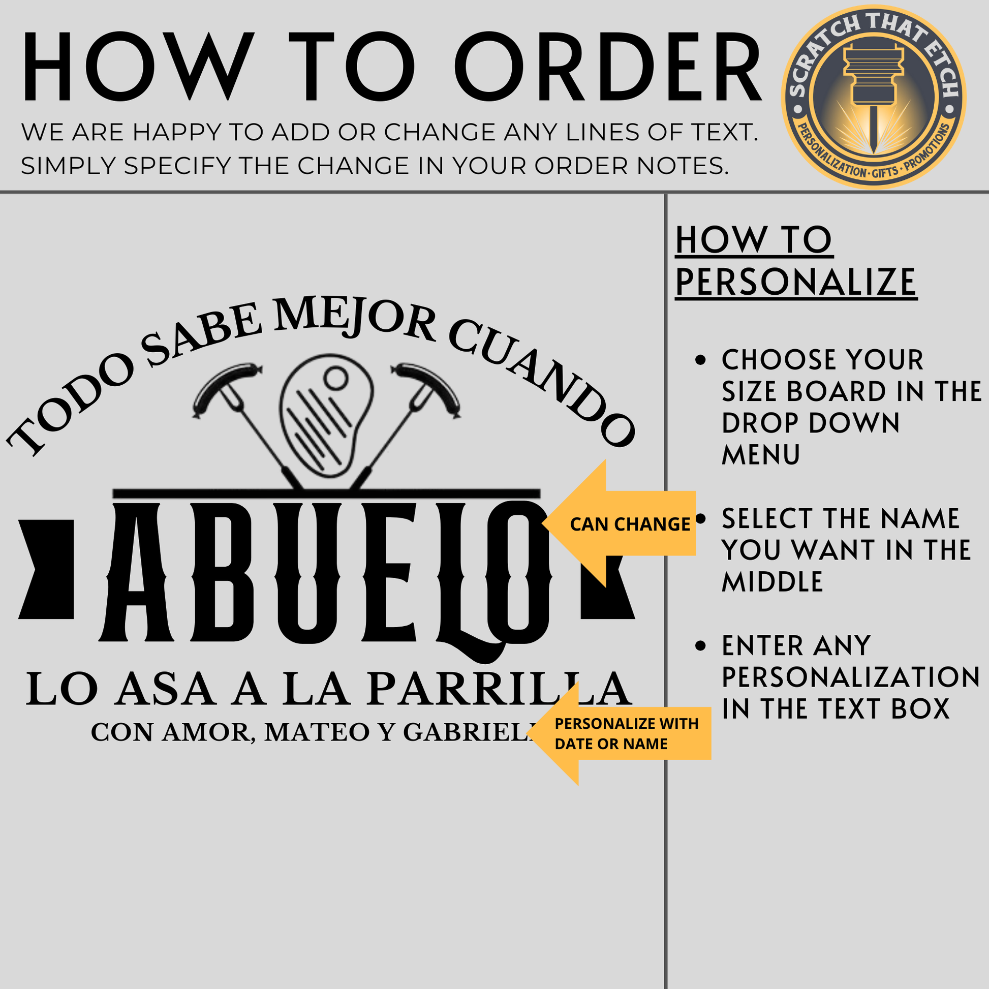 Elevate Abuelo's kitchen with a personalized cutting board crafted from your choice of sustainable bamboo or rich acacia wood. Each board features an easy-grip handle and precision engraving of 'Abuelo', 'Grandpa', a name, or a custom message. Use it as a sturdy prep surface or a handsome charcuterie and serving board. Finished smooth and conditioned for long-lasting use, it’s a standout pick for birthdays, Christmas, and any special occasion. Handwash only and oil periodically to maintain its luster.