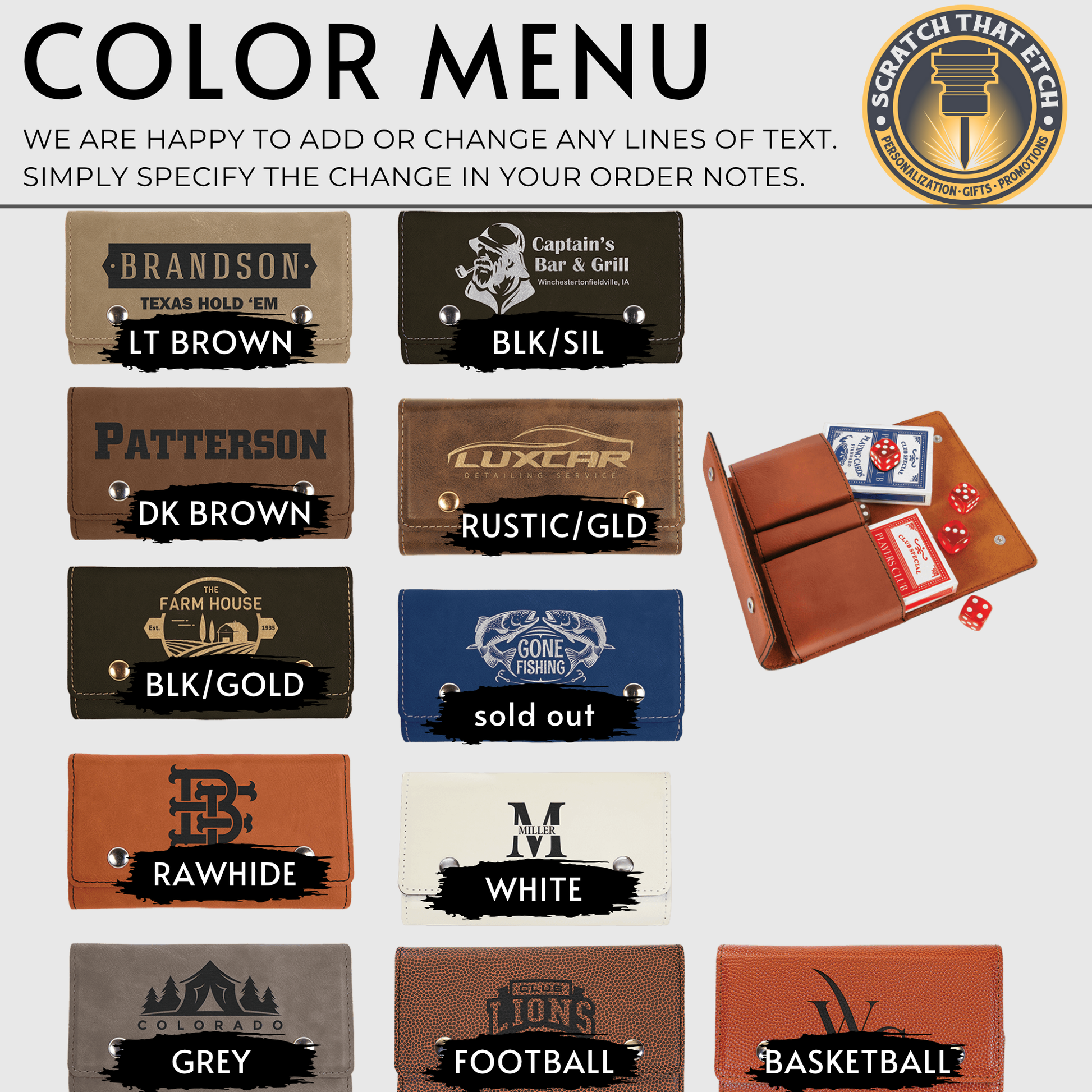 Elevate game night with a leather card and dice set that includes two decks of playing cards and five ruby red dice. The durable leather case keeps everything organized and ready to play at home or on the go. Add a personalized name or monogram to create a standout keepsake for poker, tabletop play, and family fun. Thoughtful design makes setup quick and storage simple between rounds. A smart choice for travel, camping, dorms, or the office. Durable materials are built for repeated play and long lasting enjoyment.