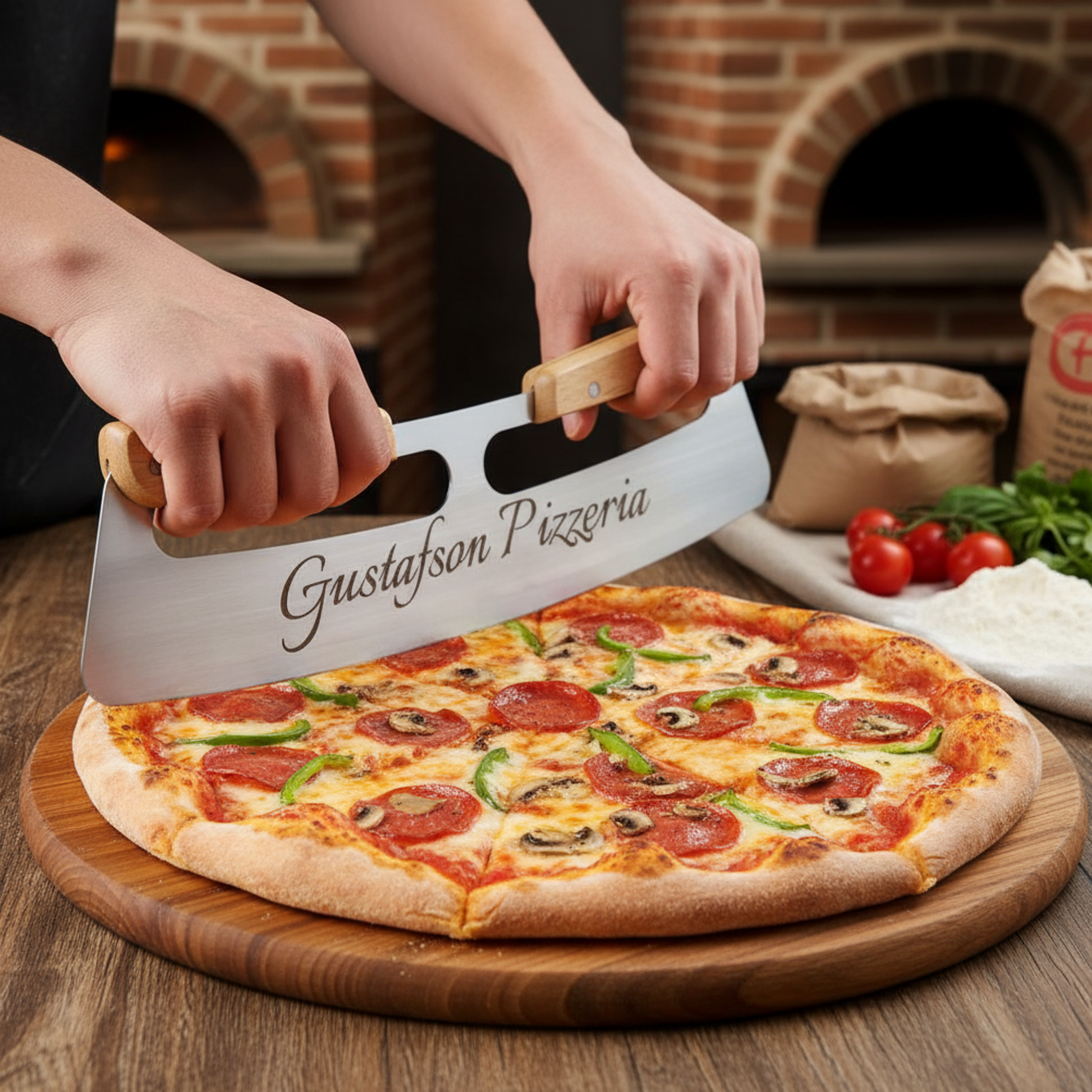 Make quick, clean slices with this rocking pizza cutter designed for smooth back and forth motion. The solid wood handles deliver a secure, comfortable grip while the protective PP cover keeps the blade shielded between uses for safer storage. Ideal for pizza, flatbreads, and chopping herbs right on the board. Built for everyday kitchen prep and pizzeria style results at home. Add a personalized touch to the wood handle to create a standout tool for your kitchen or a thoughtful surprise for a pizza lover.
