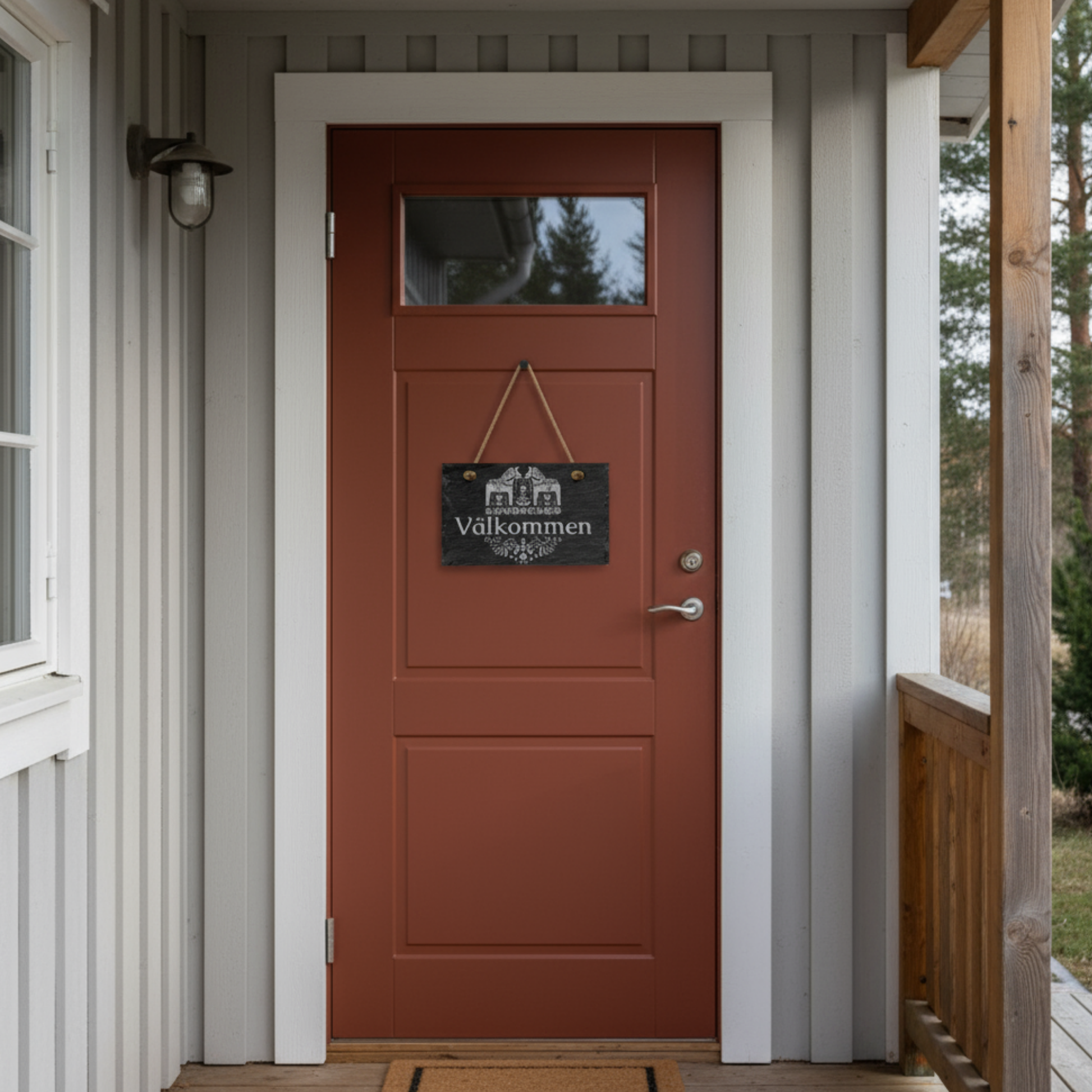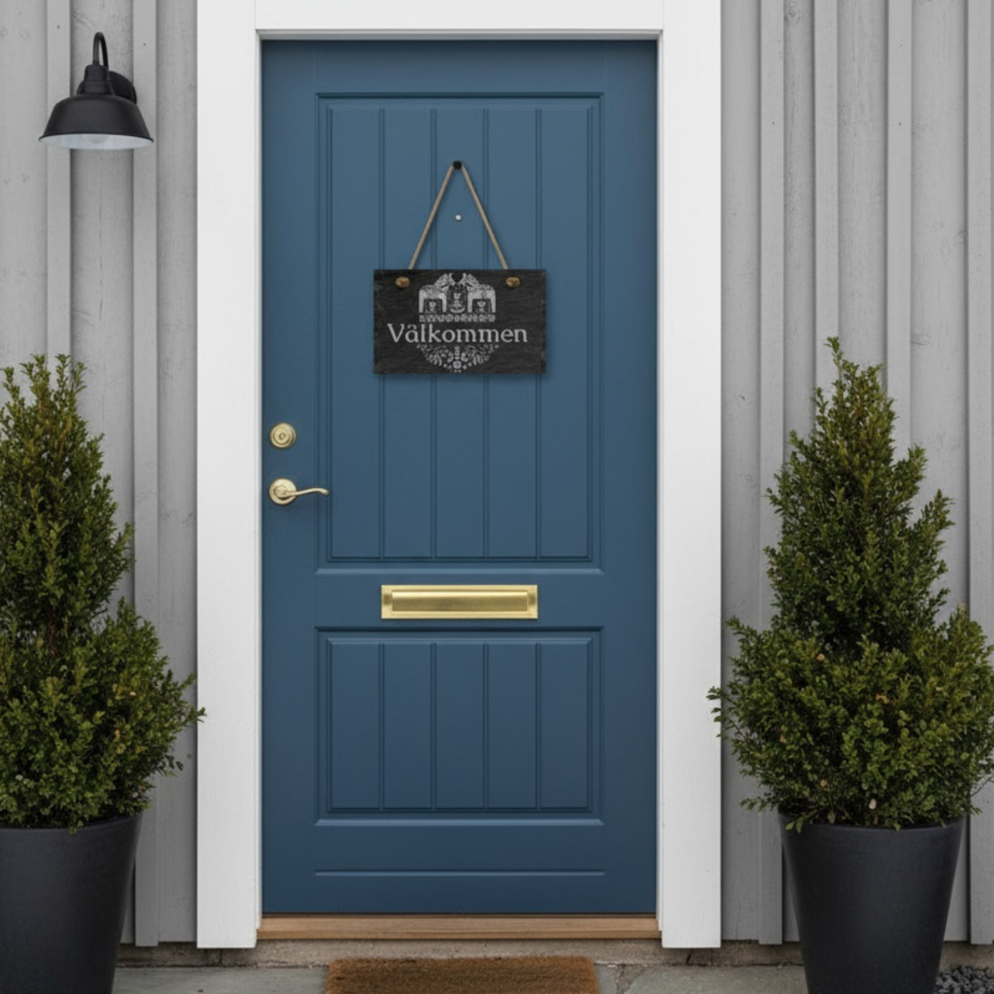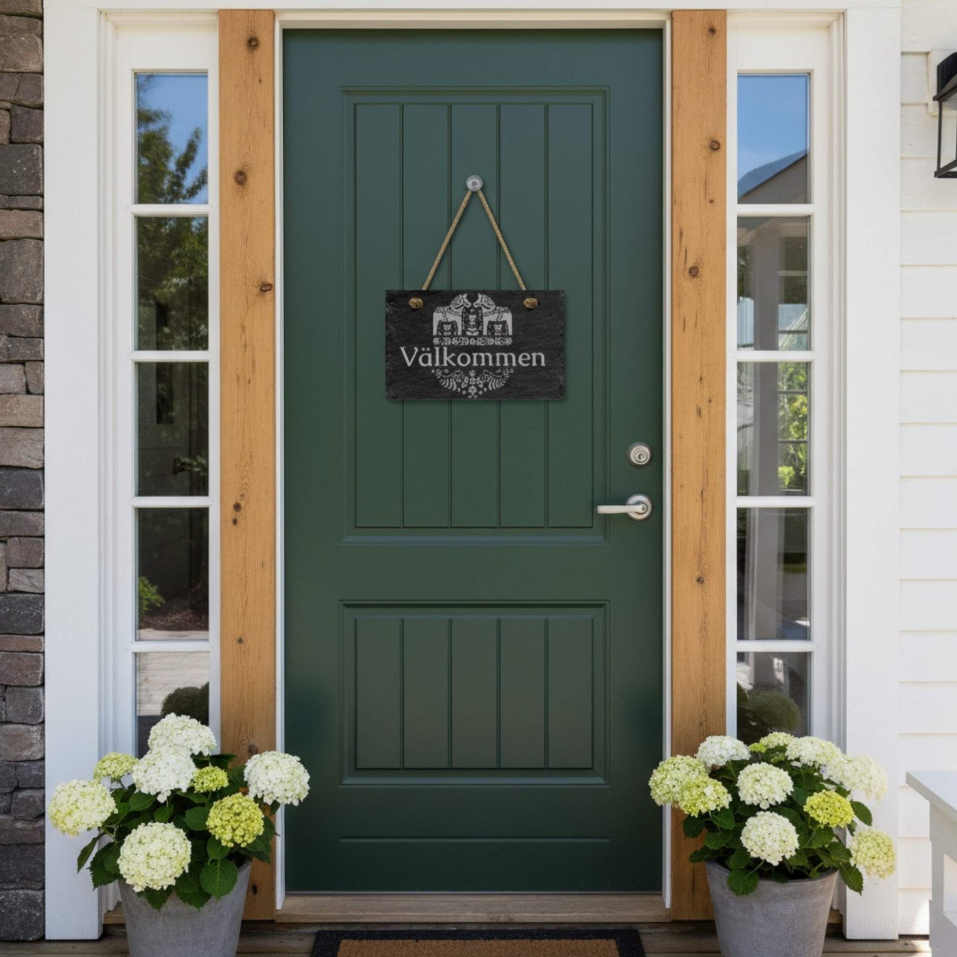- Personalized Scandinavian Valkommen hanging slate sign with multiple size options