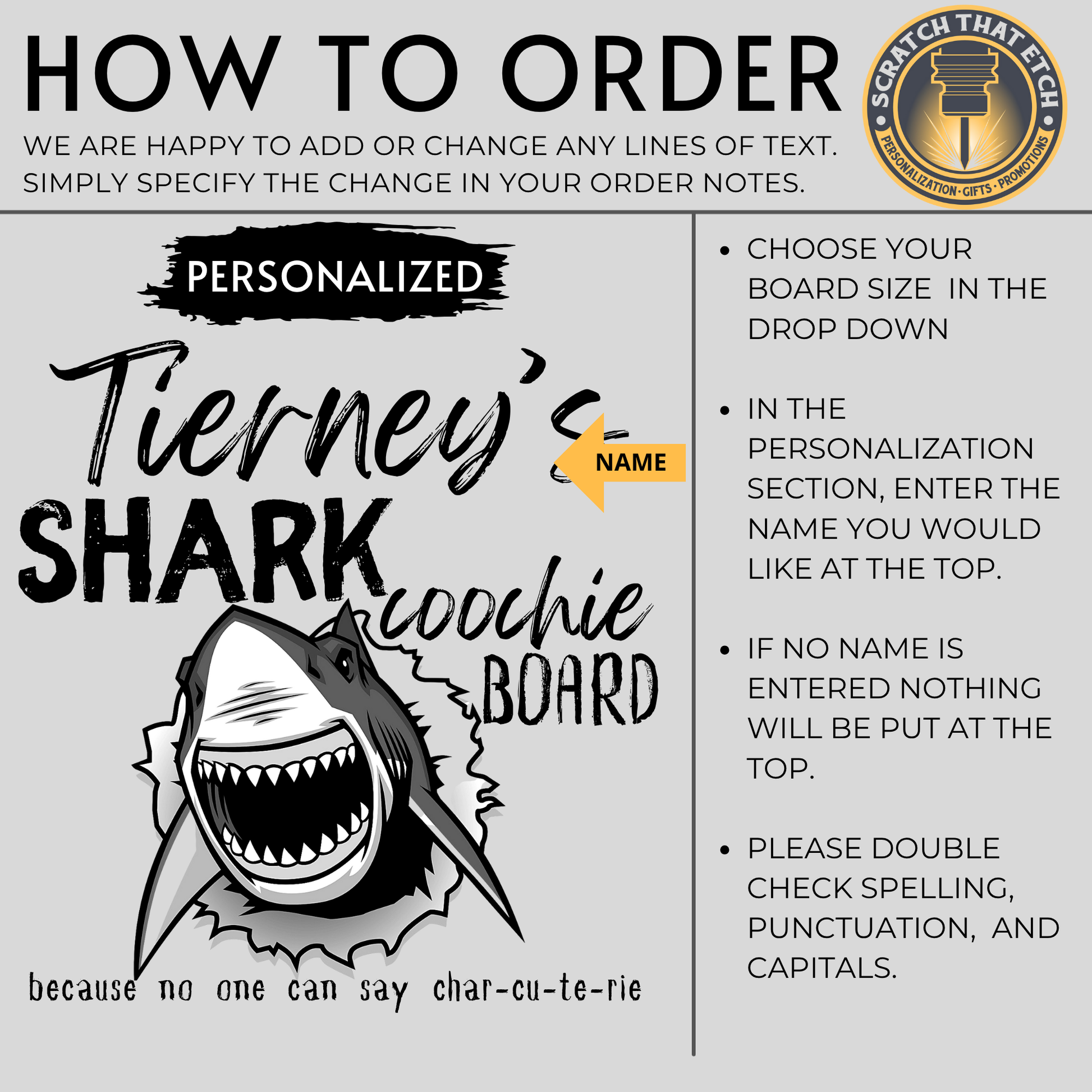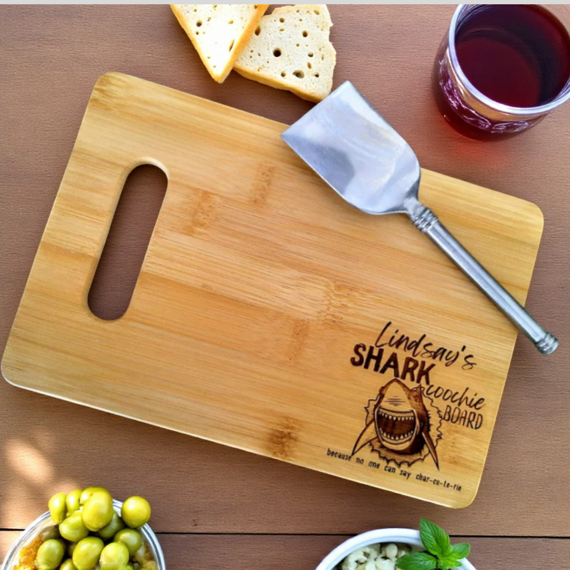 - Personalized shark coochie charcuterie cutting board with your name or short message