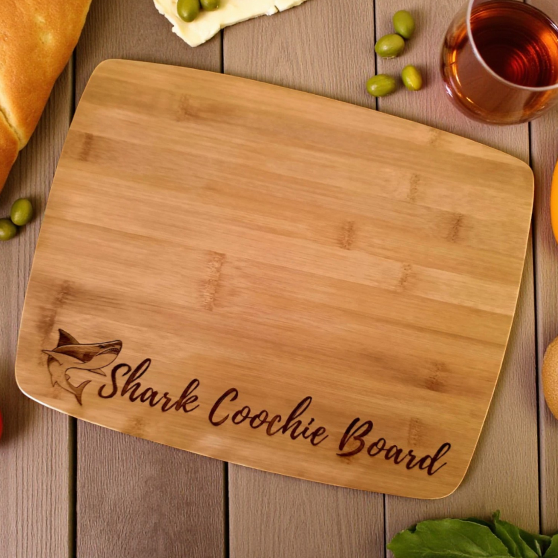 Make waves at your next spread with a shark themed charcuterie cutting board that celebrates the playful sharkcoochie pun. Crafted in your choice of sustainably sourced bamboo or richly grained acacia, Our sturdy boards shines as both a daily prep surface and a crowd pleasing serving piece. Add a personal touch with a name, phrase, or date on the presentation side, while the flip side stays ready for everyday chopping. Each board is sanded smooth and finished with food safe oil for long lasting performance.